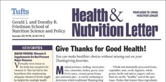 Tufts University Health & Nutrition Letter is a lifestyle guide to achieving better health. It is written with your needs in mind but is not a substitute for consulting with your physician or other health care providers. The publisher and authors are not responsible for any adverse effects or consequences resulting from the use of the suggestions, products or procedures that appear in this magazine. All matters regarding your health should be supervised by a licensed health care physician.