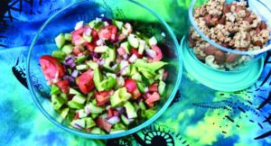 1. In a medium bowl, combine the diced cucumbers, tomatoes, red onion, and avocado.