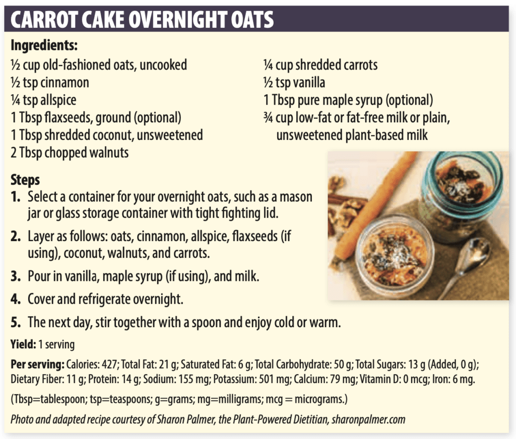 Try it! For the basic recipe, you’ll need a jar or other single-serving covered container, whole rolled oats (also called old fashioned oats) and low-fat or fat-free milk (or plain, unsweetened soymilk, which is the only plant-based milk with a significant amount of protein). Or go fancy, like this recipe for Carrot Cake Overnight Oats.