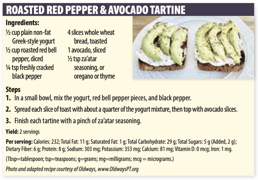 Open-Face Fabulous. You can’t go wrong with a whole grain bread topped with nutritious creamy, crunchy, sweet, and savory ingredients. Whether you’re starting with sliced whole grain bread, whole wheat English muffin, or corn or whole wheat tortillas, make sure the word “whole” appears near the top of the ingredient list. Keep toppings simple, like nut or seed butter and banana or mashed avocado and egg, or get creative, like the Roasted Red Pepper & Avocado Tartine recipe offered here.