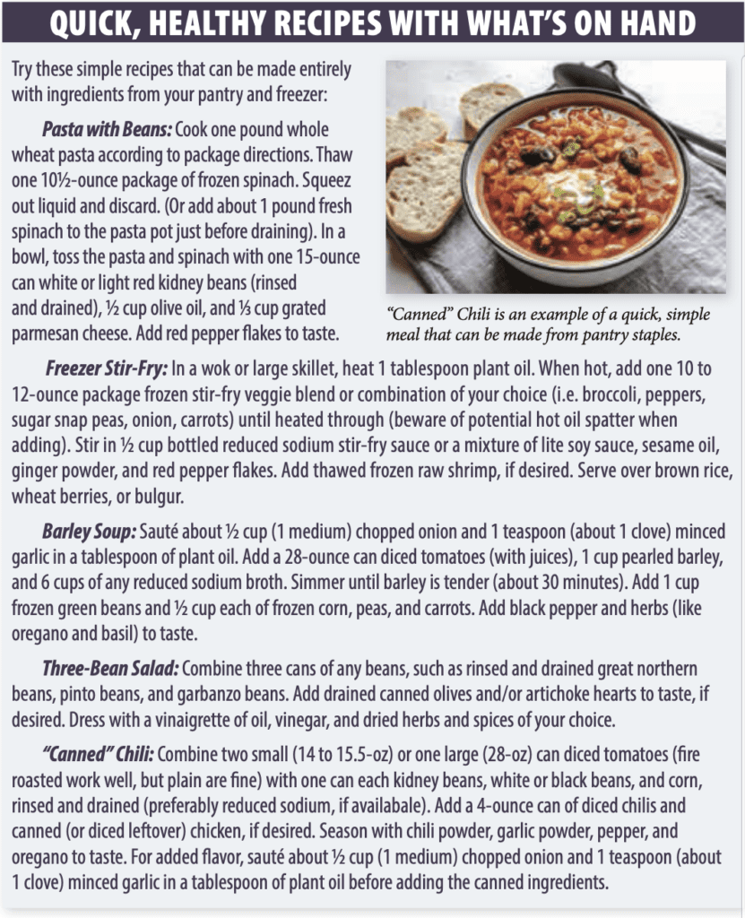 Stock your kitchen with nutritious frozen and pantry staples for making easy, healthy, delicious dishes when you haven’t had time to plan and shop (and even when you have).