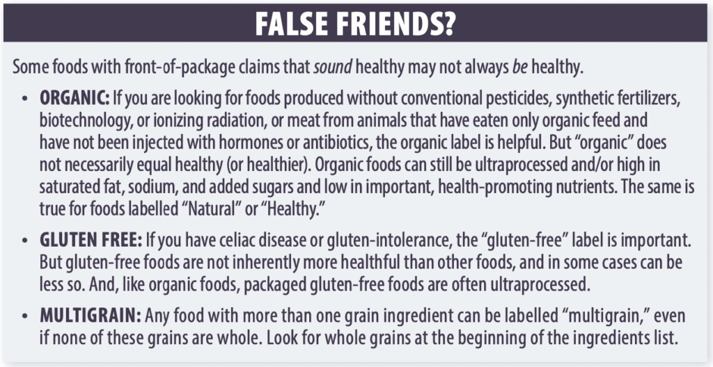 ➧ Beware of False Friends. Foods marked “organic,” “natural,” “gluten-free,” or “multigrain” can be just as processed and unhealthy as other packaged foods.