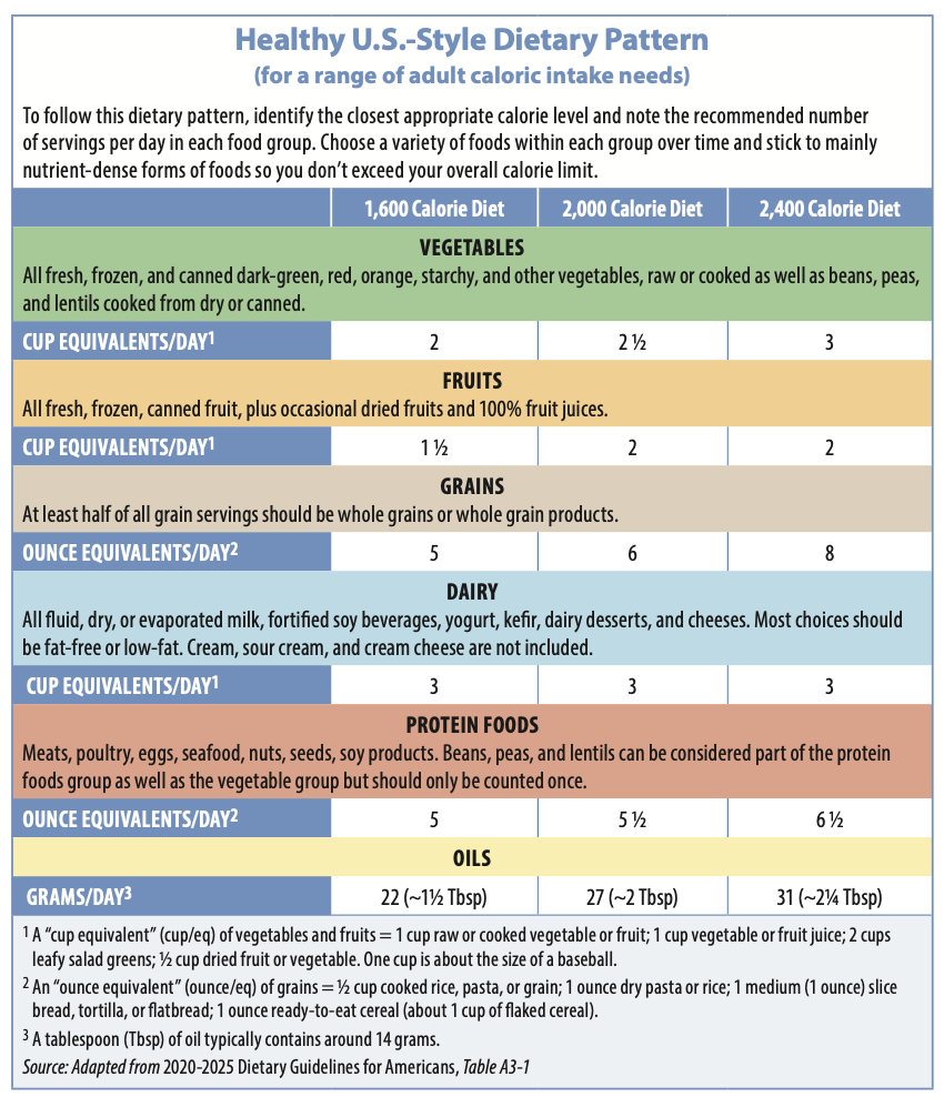Making Choices. We’ve included a chart that summarizes daily serving recommendations in the Healthy U.S.-Style Dietary Pattern for three different calorie categories. Consuming the amount of food recommended in each food group in your calorie range will allow you to meet your nutrient needs while not exceeding your calorie requirement. You will also stay within recommended limits for dietary components that tend to be overconsumed in the American diet, such as added sugars, saturated fat, and sodium. “Trying to stick to these exact recommendations is not expected,” says Lichtenstein. “They are meant to be a general guide. No one is suggesting people measure all their food and plan their dietary intake at such a micro level. In fact, such tight control is unlikely to be good for long term compliance, or for one’s mental health.”