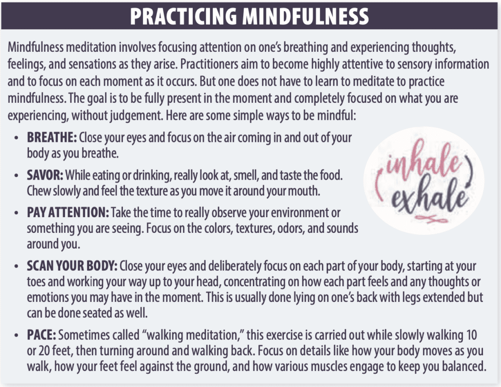 This Valentine’s Day, savor a bite of good chocolate, linger over a meal with a loved one, close your eyes and breathe in the scent of those flowers, or focus on the beauty of your surroundings as you take a peaceful nature walk. These activities are examples of ways you can practice mindfulness. Simply defined, mindfulness means paying attention to your thoughts, feelings, and/or surroundings. It can be simple (such as chewing your food slowly and really savoring the taste and feel of it in your mouth) or take more time to master (like the practice of mindfulness meditation). You can do it on your own (like taking slow, deep breaths with your eyes closed), with the guidance of an app or website, or with a trained professional (as with mindfulness-based stress reduction).